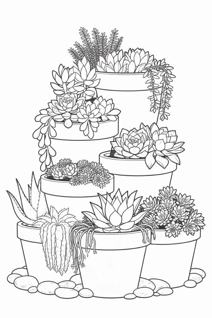 Adorable succulent coloring pages printable with teacup planters, shelf gardens, and mini pots for kids and beginners.